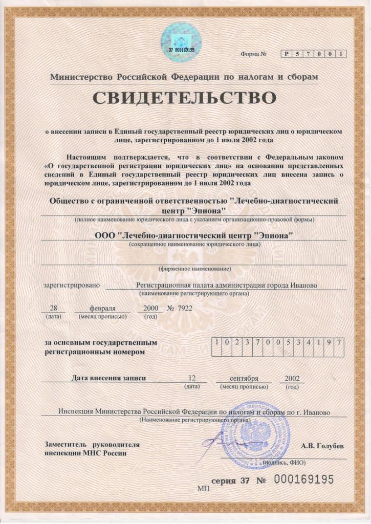 о государственной регистрации предприятия, о внесении записи в ЕГРЮЛ, о постановке на учет в налоговом органе