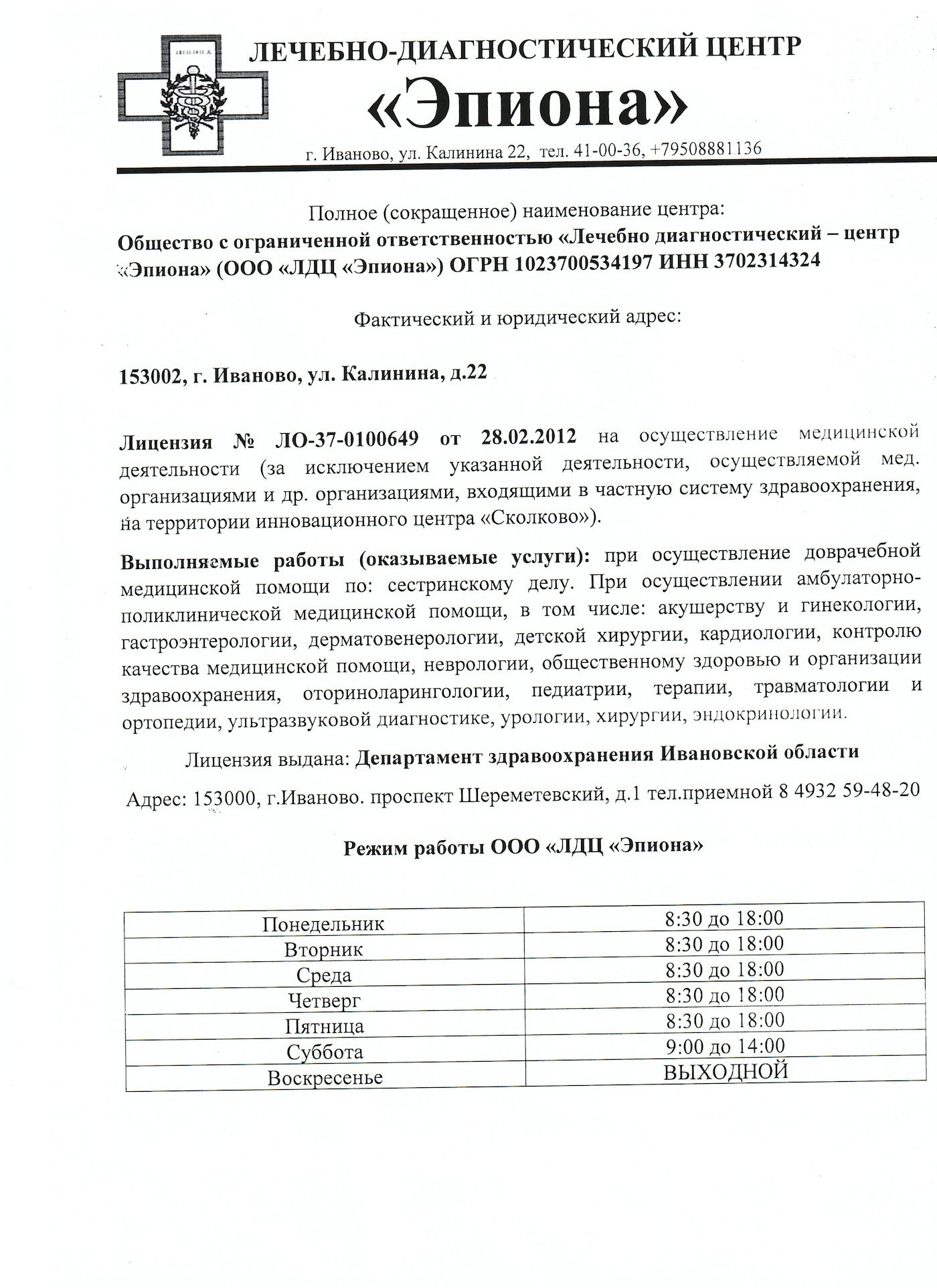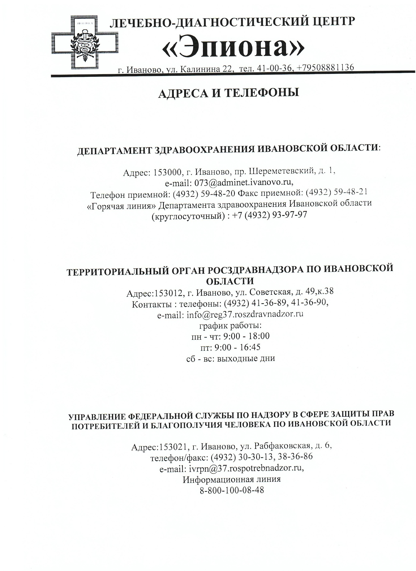 г. Иваново, ул. Калинина 22, т. 41-00-36, 41-00-35
